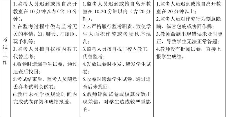 4.检查监考老师是否到岗或迟到,是否私自调串考场;领取、分发试卷是否有误,是否严格执行考场规则,是否认真履行职责。