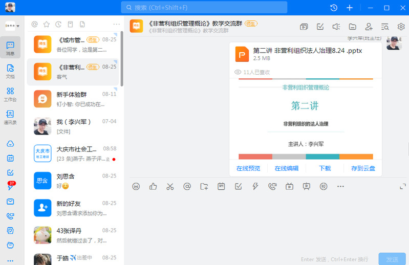 凡事预则立,不预则废。如果没有事先的充分教学准备,就不可能获得良好的教学效果。所以,在进行线上教学之前,我就把《城市管理学》和《非营利组织管理概论》两门课程的教学资料准备齐当,比如教学讲义、教案、课件、进度表、推荐书目清单、电子版书籍、教学案例,以及为课程专门设计的课堂笔记、读书笔记、小组分享课报告、调研报告的模板。同时,我在钉钉分别创建了“《城市管理学》教学交流群”和“《非营利组织管理概论》教学交流群”,然后把教学交流群的二维码发送给班级学委,邀请员工们提前加入。在上课之前,我把教学进度表、推荐书目、教学案例、课堂笔记、读书笔记、小组分享报告和调研报告的模板发送到了钉钉教学交流群,以供员工们提前查阅、下载、打印。为了保证线上授课效果,我在开课前两天,专门组织两个班级员工进行课前测试,一方面是测试网络效果,另一方面测试钉钉“线上课堂”的各个功能模块。经过测试,我和员工们都进一步熟练掌握了钉钉的各种操作。另外,为了怕员工们忘了及时上线,每次上课前半个小时,我会在钉钉教学交流群@所有员工,温馨提示上课时间。事实证明,课前的充分准备至为关键,有效保障了线上教学的顺畅运行。