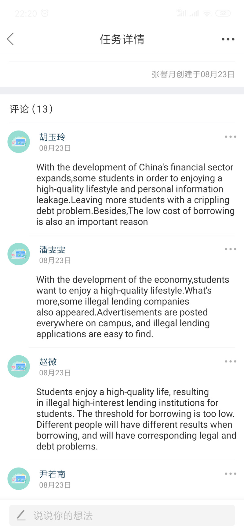 英语写作2课程,每周两学时,两个班的教学任务,共四学时。同样利用智慧树平台,以直播的方式授课,线上跟员工实时互动,员工的参与热情还比较高。但是对比看来2班的参与度要好于1班。课下也进行了反思,为什么两个班级的互动效果会有不同,如何进一步调动大家的积极性,针对员工的反馈进一步调整教学任务以及教学流程。