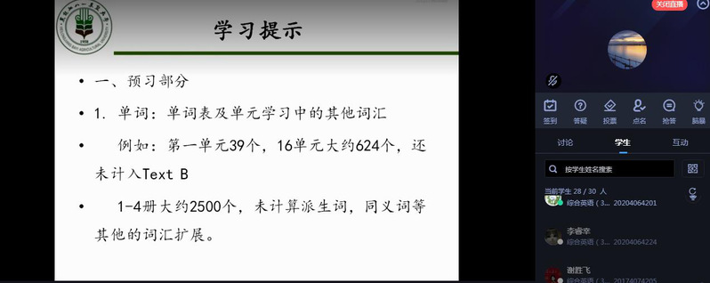 开学前跟担任1班综合英语课程教学任务的周树涛老师讨论研究适合本学期课程的线上教学的可行方案。最终决定继续使用比较熟悉的智慧树平台,采取“直播+录播”的方式。 课前,分工合作利用EV录屏软件提前录制一部分教学视频,提前录制视频能够避免突发的网络问题确保线上课程的顺利进行,也可以方便员工课后反复观看视频及时查缺补漏。直播可以跟员工实现实时在线互动,包括签到,投票,随机点名,抢答等。