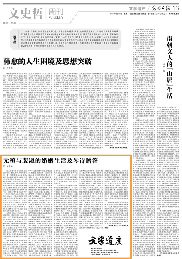 年谱、行年考、作品系年等成果,对文人生活中的科第、化官、交游等更为关注。《光明日报》刊登的田恩铭《元稹与裴淑的婚姻生活及琴诗赠答》一文另辟蹊径,对元稹与继室裴淑琴诗相和的婚姻生活,作了与众不同的梳理,文章对文人个体生活所做的探索,具有新意,对相关作家和专题研究不乏启示。