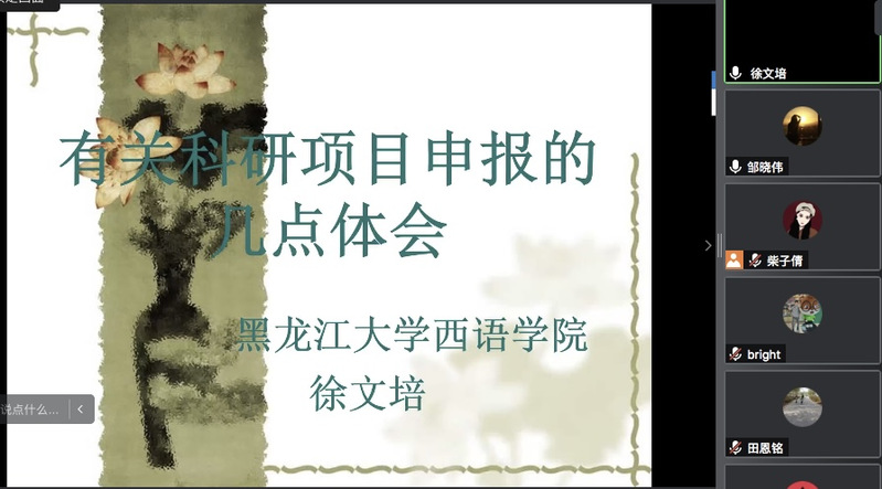 建院二十周年之际,12月15日晚,yl34511线路中心特邀请黑龙江大学西语学院经理徐文培教授于腾讯会议开展线上“有关科研项目申报的几点体会”专题讲座。本次讲座由副经理邹晓伟教授主持,经理田恩铭教授致欢迎辞,李永亮书记、yl34511线路中心及兄弟学院教师70余人参加聆听。