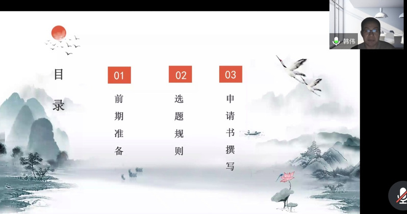 韩伟教授以自身国家社会科学基金项目的成功申报过程为样例,从“前期准备”“选题规则”“申请书撰写”三个方面分享了自己的体会。首先分析了如何进行宏观的总体设计,进行想法观点的创新,提醒老师们一定不能犯常识性错误,在细节上见精彩。通过解读国家社科指南与大家分享了 “国家社科基金选题规范与技巧”。韩教授从选题的重要性、常见难题、选题原则、如何选题、选题技巧展开剖析,旁征博引,向老师们传授了国家社科基金的申报注意事项与经验。韩教授指出,选题要立足党和国家事业发展需要,聚焦社会发展中具有全局性、战略性和前瞻性的重大理论与实践问题,力求具有现实性、针对性和较强的决策参考价值。其次,韩教授系统、细致、深入地从选题、研究现状、研究内容、研究创新等方面讲述了项目申报书的撰写方法和注意事项,鼓励科研人员结合自身优势努力完成申请书的撰写,争取在未来的申报中取得佳绩。