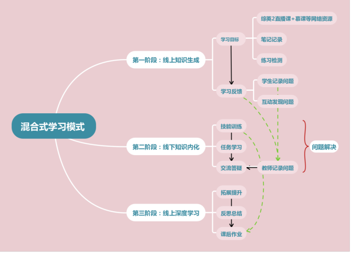 经研究学习,我应用了学者常祥琦和学者孙先洪提出的三线一体的教学流程,即:线上知识生成—线下知识内化—线上深度学习的教学流程,并建立健全相关成绩评价方法。对《综合英语2》这门课,我的课程教学流程图如图所示: