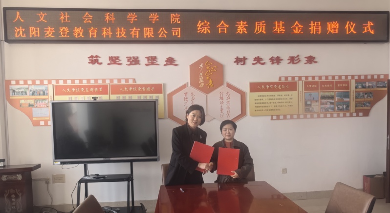 随后,双方签署了综合素质基金捐赠协议,沈阳麦登教育科技有限公司连续三年,每年向公司捐赠综合素质基金1万元,刘佳丽代表学院接受捐赠。
