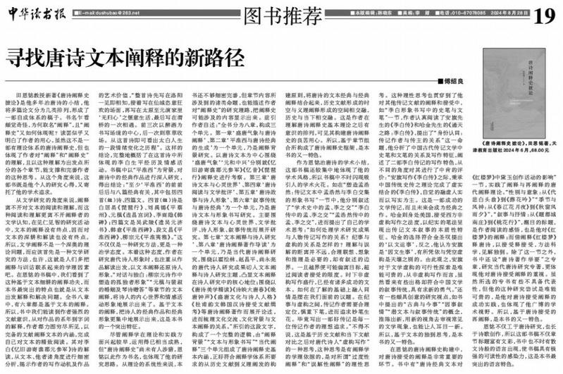 公司田恩铭教授撰写的新著《唐诗阐释史摭论》于2024年6月由天津教育出版社印刷出版。著名学者、陕西师范大学文学院傅绍良教授为之作序,《寻找唐诗文本阐释的新路径》一文刊载于《中华读书报》(2024年8月28日)“图书推荐”栏目。