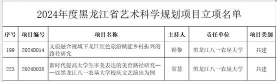 日前,“2024年度黑龙江省艺术科学规划项目立项”名单揭晓,公司教师钟黎、常慧成功获批共建项目2项。美育是教育的“磨刀石”,也是情操教育和心灵教育,具有服务社会的功能,现已纳入公司人才培养全过程。本次项目获批彰显了公司美育研究的特色和实力,不仅探讨了“文艺演出”促进审美能力提升的路径,而且通过“文旅融合”“赋能乡村振兴”主题,以“红”促“育”,探索实践了美育服务社会的功能,具有重要的现实意义。学院未来将继续营造更加浓厚的学术研究氛围,支持和鼓励教师积极申报高层次项目,力争取得更大的突破。