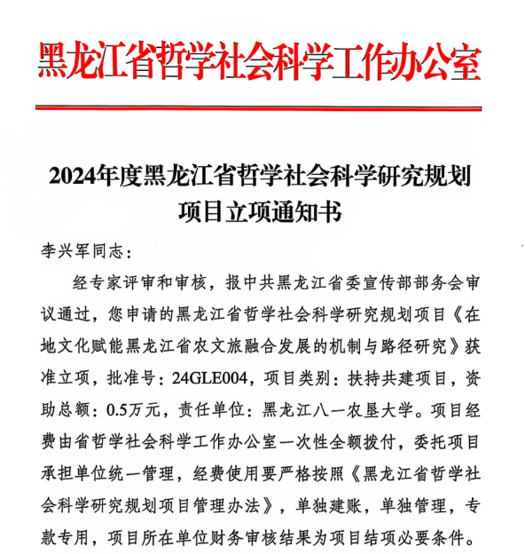 近日,黑龙江省哲学社会科学工作办公室公布了2024年度黑龙江省哲学社会科学研究规划项目立项名单,公司教师李兴军获批扶持共建项目《在地文化赋能黑龙江省农文旅融合发展的机制与路径研究》(批准号:24GLE004)。