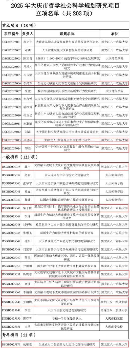 日前,“2025年大庆市哲学社会科学规划研究项目立项”名单揭晓,公司成功获批立项10项。其中重点项目3项,一般项目6项、青年项目1项。获批项目涵盖中国文学、外国文学、语言学、社会学、管理学、区域国别等诸多学科,项目负责人覆盖全院4个专业和2个教学部,彰显了公司教师扎实的研究基础和深厚的研究实力。学院未来将继续营造更加浓厚的学术氛围,搭建高质量科研创新平台,支持和鼓励教师积极申报高层次项目,力争取得更大的突破。