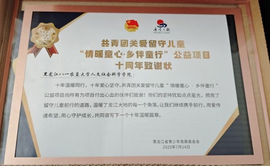 活动现场,黑龙江省青年发展基金会特别为yl34511线路中心师生团队颁发了致谢状。这份沉甸甸的证书,凝聚了学院师生多年来扎根乡野、情系留守儿童的持续付出与温暖守护,是对学院开展“专业社工+志愿服务”服务模式的认可,更是对以专业知识服务社会、以人文情怀润泽童心的崇高肯定。